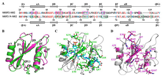 CagA EPIYA-C and EPIYA-D motifs can not only interact with SHIP2, but also with SHP2 (SH2 domain-containing phosphotyrosine phosphatase 2). SHP2 has two tandem SH2 domains, N-SH2 and C-SH2. Both N-SH2 and C-SH2 displayed a higher affinity to EPIYA-D than to EPIYA-C phosphopeptide in vitro, and N-SH2 exhibited a higher affinity to the two peptides than did C-SH2. A structural study revealed that a groove formed between the EF- and BG-loops can accommodate the hydrophobic Phe residue at the pY+5 position of EPIYA-D to achieve a higher affinity than that to EPIYA-C, which has an Asp residue at the pY+5 position [26]. However, SHIP2-SH2 exhibited a similar affinity to EPIYA-D and EPIYA-C phosphopeptides in our study. In order to explain the different bindings of SHIP2-SH2 and SHP2–SH2 to the EPIYA-C and EPIYA-D, we carried out sequence and structure alignment between SHIP2-SH2 and SHP2 N-SH2. The sequence similarity between SHIP2-SH2 and SHP2 N-SH2 was 43.9% (Figure 3A), and their overall structures were highly similar (Figure 3B). The residues consisting of the hydrophobic pocket for binding to pY+1 (Ala) and pY+3 (Ile) residues of EPIYA-D are similar. T52, I54, L65, Y81 and L88 of SHP2 N-SH2 correspond to H67, Y69, V81, Y102 and L109 of SHIP2-SH2. A major difference between the two was located in the EF- and BG-loops. The flexible EF-loop of SHP2 N-SH2 only has four residues (YGGE), while SHIP2-SH2 has nine residues (QTSQGVPVR). The flexible region of the BG-loop of SHP2 N-SH2 has eleven residues (HHGQLKEKNGD), while that of SHIP2-SH2 only has five residues (QPNQG) (Figure 3A). These should contribute to the different properties of SHIP2-SH2 and SHP2 N-SH2 binding to the EPIYA-C and EPIYA-D. Detailed comparison of the residues for binding to EPIYA-D suggest that the T42 to A57, T52 to H67, and H53 to T68 substitutions may also contribute to the different binding properties of the two SH2 domains (Figure 3C,D). Briefly, the different sequences and structures of the EF- and BG-loops should make SHIP2-SH2 unable to selectively bind with the EPIYA-C or EPIYA-D, as is the case in SHP2 N-SH2. Accordingly, the NMR titration data revealed no significant CSP in the BG-loop for either 13-mer EPIYA-C or EPIYA-D phosphopeptides.