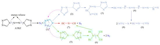 - Zhang, C.; Fu, X.; Li, J.; Fan, X.; Zhang, G. Desensitizing Effect of Graphene Oxide on Thermolysis Mechanisms of 4,4′-Azo-1,2,4-triazole Studied by Reactive Molecular Dynamics Simulations. J. Phys. Chem. A 2019, 123, 1285–1294. [Google Scholar] [CrossRef] [PubMed]