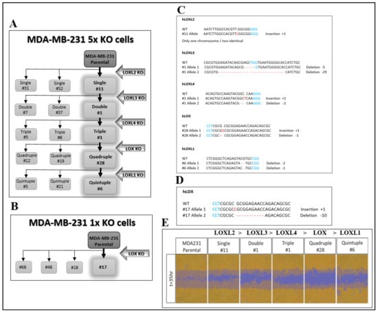 Lysyl-oxidase was identified as a secreted enzyme that catalyzed the formation of covalent bonds between collagen and elastin monomers. It was synthesized as a pro-enzyme precursor and was cleaved by the BMP-1 or ATAMTS2/14 proteases following its secretion into the extracellular space. The resulting C-terminal peptides represent the enzymatically active mature LOX [,]. Cleavage by the BMP-1 protease also released the catalytically inactive N-terminal LOX-PP peptide, which functions as an inhibitor of the ras signal transduction pathway and as a tumor suppressor [,]. LOX is a member of the lysyl-oxidase gene family, which includes five different proteins that share a highly homologous C-terminal and very similar enzyme activities []. Under hypoxic conditions, LOX is overexpressed and promotes the metastasis and invasion of breast cancer cells [,,]. In order to identify functions unique to LOX in breast cancer cells, we knocked out the five members of the lysyl-oxidase gene family in MDA-MB-231 breast cancer-derived cells.