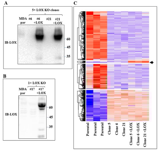 Re-expression of LOX in 5× knock-out clones resulted in changes in gene expression. (A) Western blot analysis using anti-LOX antibodies of equal volumes of conditioned medium of confluent MDA-MB-231 cells (MDA par), clone 6 and clone 21 cells and of these cells following LOX cDNA re-expression. (B) Western blot analysis using anti-LOX antibodies of equal volumes of conditioned medium of confluent MDA-MB-231 cells (MDA par) and clone 17 cells and of these cells following LOX cDNA re-expression. (C) Heat map showing color-coded expression levels of differentially expressed genes in three different plates of parental MDA-MB-231 cells, in three different 5× knock-out clones (clones 5, 6 and 21) and in these knock-out clones after re-expression of full-length LOX cDNA. The LOX cDNA did not contain epitope tags. Arrow points to a group of genes whose expression was either unchanged or inhibited following the 5× knock out but whose expression was upregulated following re-expression of the LOX cDNA.