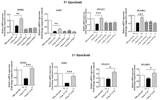 LOX was implicated previously in the control of gene expression [,,]. We therefore screened MDA-MB-231 breast cancer cells in which we knocked out all five lysyl-oxidase genes (5× cells) for the genes whose expression was either inhibited or enhanced and then further selected genes whose expression was rescued following the expression of the full-length LOX cDNA. These experiments resulted in the identification of the STOX2, AGR2, DNAJC3 and DNAJB11 as genes whose expression was downregulated following the knock out of the five lysyl-oxidase genes and whose expression could be rescued following LOX re-expression but not by other lysyl-oxidases. Similar observations were made using MDA-MB-231 cells in which we only knocked out the LOX gene. Interestingly, none of these genes have been previously identified as genes that are regulated by LOX. Notably, the expression of STOX2 and AGR2 had been previously linked to tumor progression [,,].