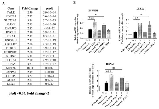 LOX expression in MB-MDA-231 5× knock-out cells resulted in the upregulation of the expression of the HSP90B1, DERL3 and HSPA5 genes. (A) A list of genes whose expression was significantly upregulated in an RNAseq screen following LOX re-expression in three different MB-MDA-231 5× knock-out clones. Listed are the genes whose expression was enhanced at least twofold and whose adjusted p values were lower than 0.05 following LOX re-expression. (B) The expression levels of HSP90B1, DERL3 and HSPA5 were determined using qRT-PCR in MB-MDA-231 clone 6 5× knock-out cells before and after re-expression of the indicated lysyl-oxidases. Results were normalized in comparison to the expression levels of the genes in parental MDA-MB-231 cells. Data represent the mean ± SEM of N independent experiments. Statistical significance was evaluated using unpaired student’s t test with Welch’s correction. * p < 0.05, ** p < 0.01, *** p < 0.001.