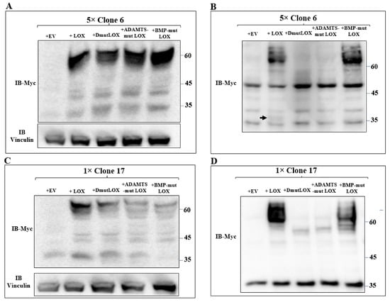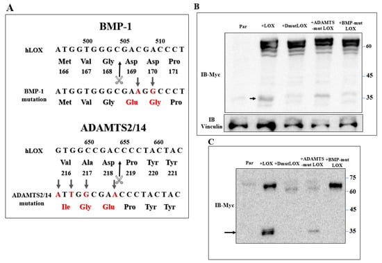 Secreted LOX is cleaved by the BMP-1 and ADAMTS2/14 proteases. The ~30-kDa and ~25-kDa C-terminals that are generated following cleavage by these proteases represent the mature, enzymatically active form of LOX [,,]. However, we could detect very little if any cleaved ~25–30-kDa LOX in the conditioned medium of the 5× or 1× knock-out cells in which we re-expressed the LOX cDNA (Figure 2A,B). These observations suggest that the LOX pro-enzyme, or the LOX peptides generated by proteases other than BMP-1 or ADAMTS2/14, may be responsible for the upregulation of these LOX-regulated genes in MDA-MB-231 cells. To examine this possibility, we introduced point mutations into the BMP-1 and into the ADAMTS2/14 cleavage sites of the LOX cDNA (Figure 5A) to generate full-length LOX cDNAs containing both mutations (DmutLOX) as well as cDNAs containing only the BMP-1 (BMP-mut LOX) or ADAMTS2/14 (ADAMTS-mut LOX) cleavage site mutations. The BMP-1 cleavage site mutation was performed following a previous publication []. We also added a myc epitope tag upstream of the LOX stop codon of the unmodified LOX as well as to the point-mutated LOX variants in order to be able to distinguish the products of these constructs from endogenous LOX. To determine the effects of these mutations on the secretion and cleavage of LOX, we first expressed the LOX/myc cDNA as well as the cDNAs encoding the point-mutated LOX/myc variants in HEK293 cells, as in these cells, LOX is efficiently cleaved following secretion []. Indeed, following the expression of the LOX/myc cDNA in these cells, the conditioned medium contained roughly equal concentrations of uncleaved LOX and mature, ~35-kDa cleaved, myc-tagged LOX (Figure 5C). The cDNAs encoding the point-mutated forms of LOX were expressed in these cells at comparable levels of expression as determined by examination of the cell lysates (Figure 5B). BMP-mut LOX was efficiently secreted but, as expected, failed to be cleaved, suggesting that under these conditions, there is no cleavage at the ADAMTS2/14 cleavage site. In contrast, ADAMTS-mut LOX was poorly secreted, and the fraction that was secreted was partially cleaved by BMP-1 (Figure 5C). Finally, DmutLOX failed to be cleaved and was secreted very poorly (Figure 5C). Interestingly, in the lysates derived from these cells, we also found additional myc-tagged bands which were likely generated from LOX by uncharacterized proteases, as these bands were not present in the cell lysates derived from wild-type HEK293 cells (Figure 5B).