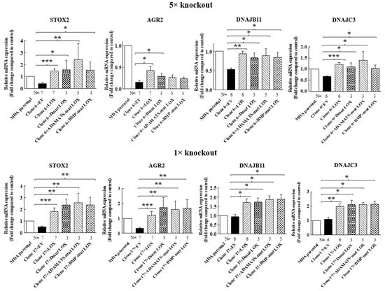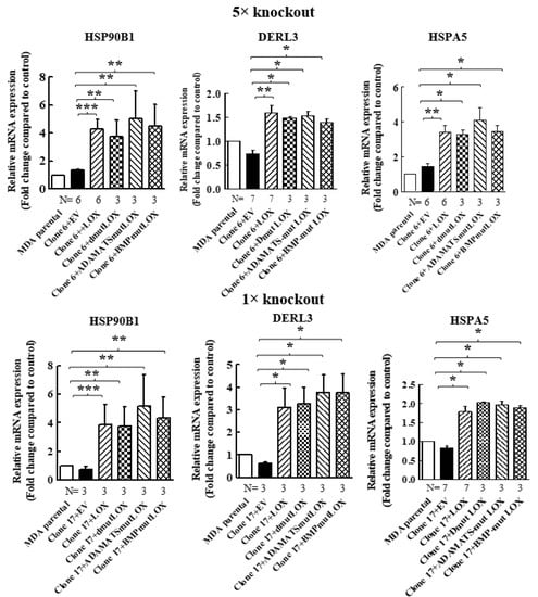 We then determined if the expression of STOX2, AGR2, DNAJB11 and DNAJC3 genes could also be induced by LOX mutants that did not undergo cleavage by BMP-1 or ADAMTS2/14. Indeed, we found that the expression of these genes could be induced by DmutLOX as well as by ADAMTS-mut LOX and BMP-mut LOX when the cDNAs encoding them were expressed in either the clone 6 5× knock-out cells or clone 17 1× knock-out cells (Figure 7). The only exception was the AGR2 gene, which was only partially induced by the double mutant and by the single mutants in the clone 6 cells. However, the induction failed to reach statistical significance in the case of the single mutants. Notably, these single mutants did enable significant induction of AGR2 expression in the clone 17 1× cells (Figure 7). We similarly tested three of the genes that were not downregulated by the knock-out of LOX but whose expression was induced following the re-expression of LOX in the clone 6 5× knock-out cells (Figure 4). The HSP90B1, DERL3 and HSPA5 genes were also induced by the three LOX point mutant variants in the 5× and 1× knock-out cells (Figure 8), suggesting that the expression of these three genes is also induced by the LOX pro-enzyme rather than by cleaved, enzymatically active LOX (Figure 8).