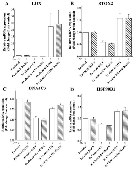 The LOX-induced expression of the STOX2, DNAJC3 and HSP90B1 genes does not require LOX enzyme activity. Parental MB-MDA-231 cells (parental), clone 6 5× knock-out cells infected with empty lentiviruses (5× clone 6 + EV) or clone 6 x5 knock-out cells expressing the LOX cDNA (5× clone 6 + LOX) were cultured in the absence or presence of 250 μM BAPN and 5 μM CuSO4 for 48 h. Subsequently, the mRNA expression of LOX (A), STOX2 (B), DNAJC3 (C) and HSP90B1 (D) was examined using qRT-PCR. Results were normalized with the expression level in MB-MDA-231 parental cells in each of the experiments. Data represent the mean ± SEM of N independent experiments.
