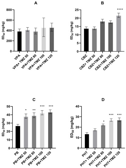 Effect of trimetazidine (TMZ) on the anticonvulsant action of (A) valproate (VPA), (B) carbamazepine (CBZ), (C) phenobarbital (PB), and (D) phenytoin (PHT) against maximal electroshock-induced seizures in mice. Data are presented as median effective doses (ED50 in mg/kg) with standard errors (SEM) that protect 50% of animals from the tonic-clonic seizures. Statistical analysis of the data was performed using one-way analysis of variance (ANOVA) followed by a post hoc Tukey test. * p < 0.05, ** p < 0.01, *** p < 0.001, **** p < 0.0001 vs. control group.