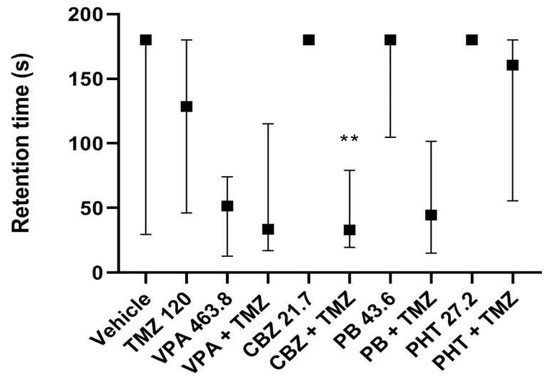Results are shown as median retention time (with 25th and 75th percentiles) during which mice avoided the dark room in the step-through passive-avoidance task. Drug doses used in this test reflect ED50 doses of combinations of TMZ (120 mg/kg) with the antiepileptic drugs from the MES test. Statistical analysis of data was performed using a nonparametric Kruskal–Wallis ANOVA test followed by Dunn’s post hoc test. TMZ—trimetazidine, VPA—valproate, CBZ—carbamazepine, PB—phenobarbital, PHT—phenytoin, ** p < 0.01 vs. CBZ.