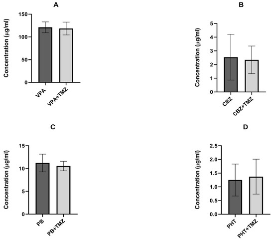 Effect of trimetazidine (TMZ) on the brain levels of (A) valproate (VPA), (B) carbamazepine (CBZ), (C) phenobarbital (PB), and (D) phenytoin (PHT). Results are presented as the ±SD (in µg/mL) of at least eight determinations. Statistical analysis was performed using an unpaired Student’s test. TMZ—trimetazidine, VPA—valproate, CBZ—carbamazepine, PB—phenobarbital, and PHT—phenytoin.
