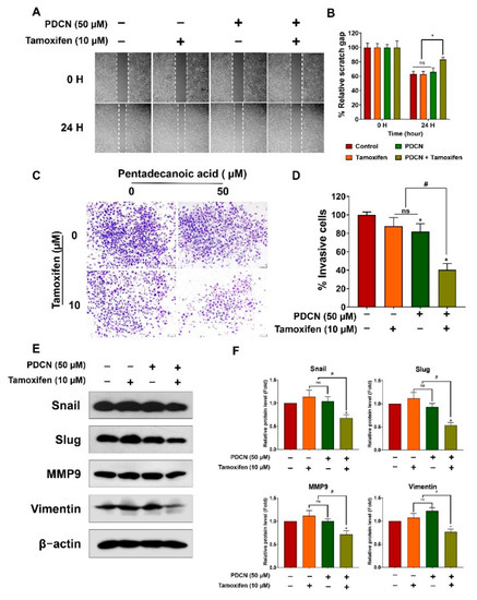 2.6. Effect of Combined Pentadecanoic Acid and Tamoxifen Treatment on Epithelial–Mesenchymal Transition