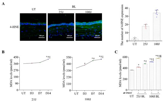 Showing representative photograph and the mean number of 4-HNE expression by IHC (A) in the cornea of the UT, 25 J BL, and 100J BL groups, after 14 days of BL exposure. ELISA for MDA (B) in the cornea of the UT, 25 J BL, 25J BL+4P-PDOT, 100 J BL, and 100 J BL+4P-PDOT groups. (B) * p < 0.05 vs. UT, † p < 0.05 vs. D3, ‡ p < 0.05 vs. D7; (C) * p < 0.05 vs. UT, † p < 0.05 vs. 25J BL, ‡ p < 0.05 vs. 25J BL+4P-PDOT, § p < 0.05 vs. 100 J BL; UT, untreated; BL, blue light.