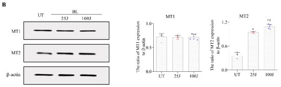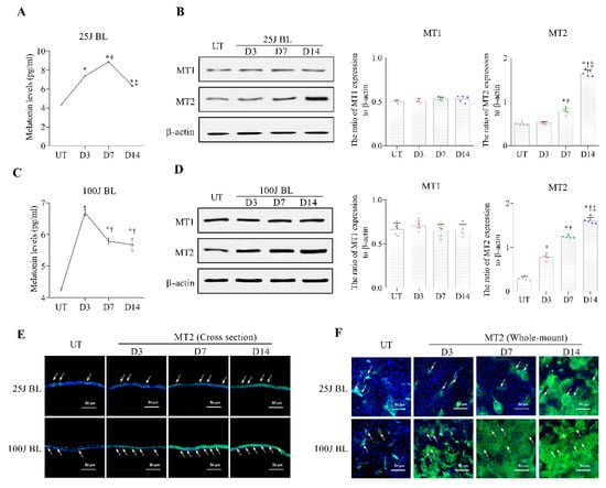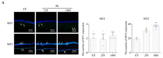Expression of MT1 and MT2 by IHC (A) and Western blotting (B) in the cornea of the UT, 25 J BL, and 100 J BL groups, after 14 days of BL exposure. * p < 0.05 vs. UT, † p < 0.05 vs. D3, UT, untreated; BL, blue light.