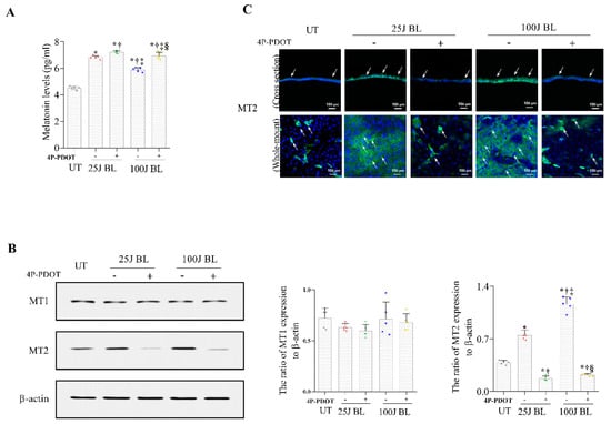 ELISA for melatonin levels (A) and Western blotting (B) for the expression of MT1 and MT2 in the cornea of the UT, 25 J BL, 25 J BL+4P-PDOT, 100 J BL, and 100 J BL+4P-PDOT groups, after 14 days of BL exposure. IHC (C) for MT2 expression in the mouse cornea treated or not treated with MT2 antagonist at day 14 of BL induction. * p < 0.05 vs. UT, † p < 0.05 vs. 25J BL, ‡ p < 0.05 vs. 25J BL+4P-PDOT, § p < 0.05 vs. 100 J BL; UT, untreated; BL, blue light.