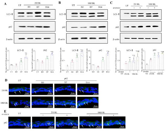 Western blotting (A–C) for the expression of LC3-Ⅱ and p62 and IHC (D,E) for p62 expression in the cornea of the UT, 25J BL, 25J BL+4P-PDOT, 100J BL, and 100J BL+4P-PDOT groups after 14 days of BL exposure. (A,B) * p < 0.05 vs. UT, † p < 0.05 vs. D3, ‡ p < 0.05 vs. D7; (C) * p < 0.05 vs. UT, † p < 0.05 vs. 25J BL, ‡ p < 0.05 vs. 25J BL+4P-PDOT, § p < 0.05 vs. 100J BL; UT, untreated; BL, blue light.