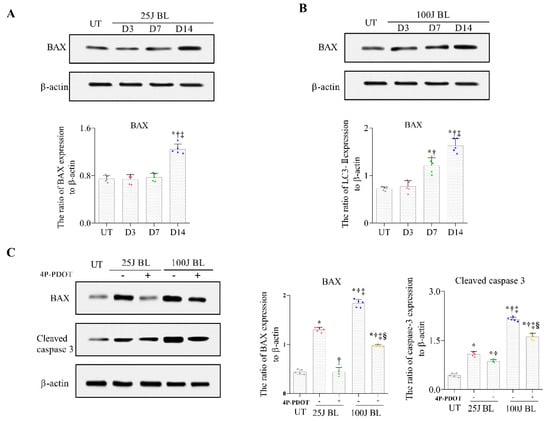 Western blotting (A,B) for BAX expression in the cornea of the UT, 25J BL, and 100J BL groups, on 3, 7, and 14 days of BL exposure. The expression of BAX and cleaved caspase-3 in the cornea of the UT, 25J BL, 25J BL+4P-PDOT, 100J BL, and 100J BL+4P-PDOT groups using Western blotting, after 14 days of BL exposure. (A,B) * p < 0.05 vs. UT, † p < 0.05 vs. D3, ‡ p < 0.05 vs. D7; (C) * p < 0.05 vs. UT, † p < 0.05 vs. 25J BL, ‡ p < 0.05 vs. 25J BL+4P-PDOT, § p < 0.05 vs. 100J BL; UT, untreated; BL, blue light.