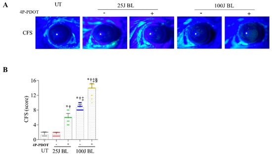 Representative 16× magnified photograph (A) and the mean corneal fluorescein staining scores (B) in the cornea of the UT, 25J BL, 25J BL+4P-PDOT, 100J BL, and 100J BL+4P-PDOT groups, after 14 days of BL exposure. * p < 0.05 vs. UT, † p < 0.05 vs. 25J BL, ‡ p < 0.05 vs. 25J BL+4P-PDOT, § p < 0.05 vs. 100J BL; UT, untreated; BL, blue light.