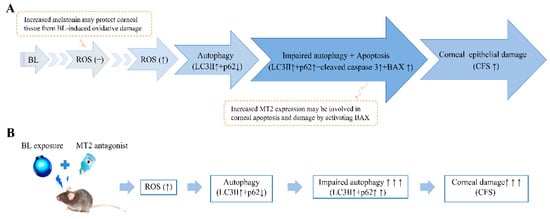 In conclusion, BL exposure induces MT2 activation. MT2 expression can reduce abnormal autophagy responses by increasing the activation of BAX (Figure 8). Our study suggests that the MT2-BAX signaling pathway may be involved in impaired autophagy and apoptosis induced by BL exposure, ultimately regulating corneal epithelial damage.
