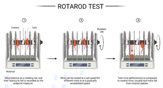 Schematic illustration of the rotarod setup and test principle. Created with BioRender.com (accessed on 14 August 2022).