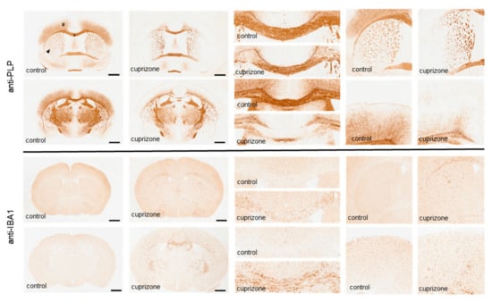 Representative images of anti-PLP and anti-IBA1 stained sections from control and 5 weeks cuprizone-intoxicated mice to demonstrate demyelination and the concomitant activation of microglia. * = midline of the corpus callosum; # = motor cortex; arrowhead = caudoputamen, Scale bar: 1 mm. Adopted from [].