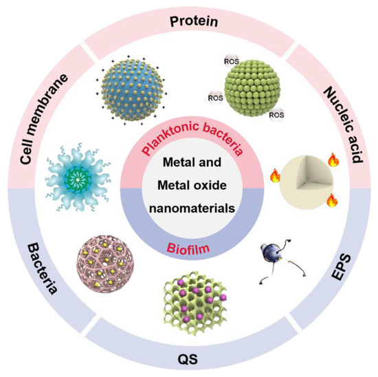 With the rapid development of nanotechnology, metal and metal oxide nanomaterials have emerged as promising therapeutics in anti-infective fields due to their excellent characteristics, including low cost and strong heat resistance. Importantly, they do not cause the development of drug resistance [18]. The anti-infective mechanisms of metal and metal oxide nanomaterials are mainly divided into three types, including the destruction of bacterial cytoskeleton, the generation of metal ions, and reactive oxygen species (ROS). They can not only kill planktonic bacteria, but also inhibit the formation of biofilm or destroy the formed biofilm by destroying EPS, inhibiting QS, and killing bacteria inside the biofilm. For example, He et al. constructed Au-Ag nanoshells to kill multidrug-resistant bacteria by high heat and silver ions (Ag+) [19]. Ali et al. pointed out that Au nanoparticles (NPs) can be used as nanoantibiotics to eliminate the biofilms of Pseudomonas aeruginosa [20]. From the aforementioned points, and taken together, metal and metal oxide nanomaterials provide a new weapon for the treatment of infective diseases.