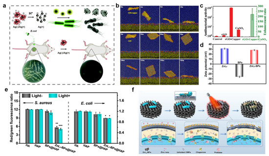The bacterial cell membrane, which plays a selective barrier role, is a semipermeable membrane consisting of a phospholipid bilayer and proteins. The fundamental constituents of membrane proteins are amino acids, which can separate into positively charged amino groups and negatively charged carboxyl groups in solution. Thus, bacteria present negative charge under physiological conditions [64]. According to previous studies, metal and metal oxide nanomaterials can release metal ions under acidic conditions to induce bacterial death [65]. In particular, the electrostatic interaction between metal ions and bacterial cell membrane alters the membrane potential and causes K+ efflux, which further destroys the integrity of the cell membrane. The outflow of cytoplasmic contents through the pores eventually leads to bacterial death [54,66,67,68]. For instance, Nie et al. prepared Ag (−)/Ag (+) clusters with a positive zeta potential consisting of cysteine-modified Ag NPs and methyl maleic-acid-modified Ag NPs (Figure 2a). The results showed that their high bactericidal ability was attributed to the strong interaction between the positively charged nanoclusters and the negatively charged bacteria under the acidic environment [69]. Similarly, copper ions can combine with bacteria through electrostatic interaction to inhibit bacterial growth (Figure 2b,c) [70]. Moreover, zinc ions can also cause membrane potential disruption by adhering to the cell membrane. For example, Wu et al. proposed a win-win strategy based on a zinc sulfonate ligand–black phosphorus@ hydroxylapatite (ZnL2-BPs@HAP) for bacterial elimination and osteogenesis [71]. ZnL2-BPs showed a positively charged surface with the modification of ZnL2 (Figure 2d). The positively charged ZnL2-BPs disturbed bacterial membrane potential (Figure 2e,f).