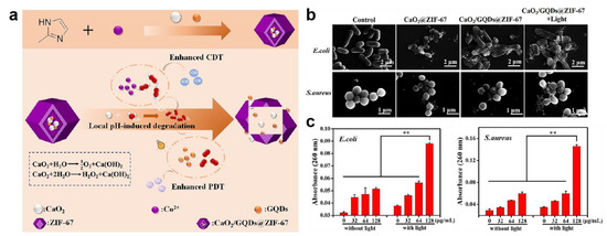 Most of the time, the production of ROS is directly correlated with the release of cations. Large amounts of ROS will damage membrane proteins and lead to lipid peroxidation, ultimately causing collapse of the cell membrane structure [72]. Ma et al. constructed a pH-responsive oxygen and H2O2 self-supplying zeolitic imidazolate framework-67 (CaO2/GQDs@ZIF-67) nanosystem for photothermal therapy/chemodynamic therapy (CDT) combination antibacterial therapy (Figure 3a) [73]. The endogenous cobalt ion derived from ZIF-67 catalyzed H2O2 to produce hydroxyl radicals for CDT. The results of scanning electron microscope imaging and DNA and RNA leakage confirmed that severe cell membrane breakdown occurred (Figure 3b,c). Zhou et al. designed a metal–organic framework-based nanoplatform named MnFe2O4@MIL/Au&GOx for eliminating Gram-positive and Gram-negative bacteria (Figure 4a) [74]. It was found that MnFe2O4@MIL/Au&GOx could produce large amounts of ROS based on its peroxidase-like activity. Scanning electron microscope and transmission electron microscope images of E. coli and S. aureus demonstrated the cell-membrane-disrupting ability of ROS (Figure 4b).