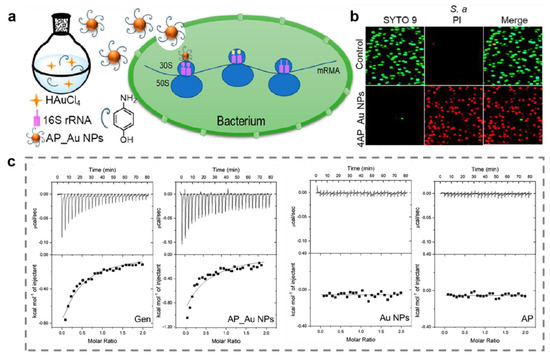 Protein destruction by aminophenol (AP)-modified gold nanoparticles (AP_Au NPs). (a) The antibacterial mechanism of AP_Au NPs. (b) Evaluation of live-dead staining of bacteria. (c) Isothermal titration calorimetry analysis of the interface between different agents and bacterial 16S rRNA. Reprinted with permission from Ref. [81]. Copyright 2022 American Chemical Society.