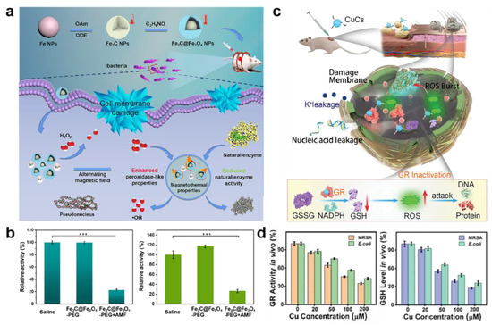 Instead of breaking cell membrane, metal and metal oxide nanomaterials can also eliminate bacteria by interfering with proteins. Aminoglycoside antibiotics work primarily by inhibiting the synthesis of bacterial proteins, which are mainly used for systemic infections caused by sensitive aerobic Gram-negative bacilli in clinical practice [80]. Inspired by the structural characteristics of aminoglycoside antibiotics, Wang and coworkers designed aminophenol modify Au nanoparticles (AP_Au NPs) with broad antibacterial spectrum against multidrug-resistant bacteria [81]. AP_Au NPs with hydroxyl groups bind to the 16S rRNA molecules of bacteria by forming hydrogen bonds to block bacterial protein synthesis, ultimately causing bacterial death (Figure 5). In addition to the direct inhibition of protein synthesis, metal and metal oxide nanomaterials can also break down natural enzymes that are essential for bacterial life, such as adenosine triphosphatases and GR [82]. The optimum temperature of natural enzyme is usually 37 °C. The enzyme activity will be diminished or even lost at high temperature due to the disruption of active sites [83]. Metal and metal oxide nanomaterials with magnetothermal or photothermal properties are capable of generating hyperthermia when treated with near-infrared light or alternating magnetic fields, which have drawn growing interest in the antibacterial field [84,85]. Sun et al. constructed a unique yolk–shell Fe2C@Fe3O4-PEG thermogenic nanozyme with highly magnetothermal properties for synergistic antibacterial application [86]. This nanozyme could generate hyperthermia with the treatment of alternating magnetic fields. The results of the enzyme activity assay revealed a nearly 80% inhibition of the typical natural enzyme activities in bacteria (Figure 6a,b). Copper is able to bind to GR to induce its inactivation, according to the previous study [87,88]. GR can catalyze the reduction of glutathione disulfide (GSSG) to reduced glutathione (GSH) to maintain redox homeostasis in bacteria [43]. If the activity of GR is inhibited, the cellular antioxidant system will be imbalanced and the bacterial cell will be apoptotic due to excessive intracellular ROS. Zhang et al. showed novel antibacterial copper clusters (CuCs) with excellent broad-spectrum antibacterial activity [30]. The results indicated that CuCs could not only disassemble bacterial membranes, but also provide to the imbalance of the GSH/GSSG ratio via suppressing the activity of GR, eventually leading to bacterial death (Figure 6c,d). Apart from Cu and Fe nanomaterials, ultrasmall Au nanoclusters can promote the upregulation of pro-oxidase and inhibit reductase, causing bacterial death by inducing metabolic imbalance of bacterial cells [89]. In addition, the small-sized Ag NPs can penetrate the bacterial cell membrane to cause intracellular enzyme inactivation through reacting with the -SH of enzyme [90]. Ag NPs can also inhibit signal transduction pathways of bacteria to eradicate bacteria [91].