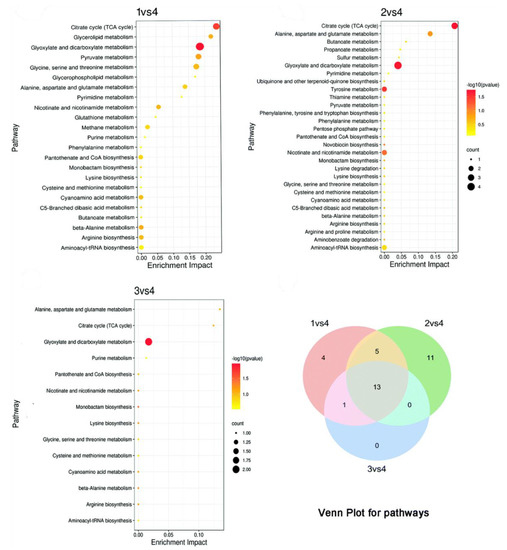 The pathway enrichment and Venn plot of pathways of three group pairs (1: NOR + Ag NFs, 2: Ag NFs, 3: NOR; 4: Control).