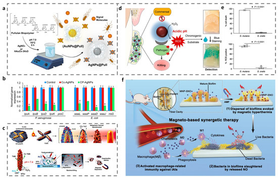 Disruption of the breaking of EPS and QS contribute to biofilm removal. Notably, planktonic bacteria is a prerequisite for biofilm formation and killing the bacteria within biofilm is essential for efficient biofilm removal [118]. Otherwise, the surviving bacteria will form a new biofilm by choosing a suitable substrate to colonize again, causing a more serious infection [119]. Metal-based nanozymes catalyze the conversion of H2O2 to the more toxic ROS through typical peroxidase-like reaction, which have attracted tremendous attention in antibiofilm therapy [120,121,122]. For example, Kumar et al. eradicated biofilm using mixed FeCo-oxide-based surface-textured nanostructures with magnetocatalytic activity [116]. The findings demonstrated that the biofilm and embedded bacteria were damaged by the defensive ROS (Figure 11c). In addition, the functionalized nanoenzyme can also selectively identify and kill harmful flora without affecting normal flora. Liu et al. reported the application of ferumoxytol iron oxide nanoparticles (FerIONP) for the removal of pathogenic dental biofilms [117]. By catalytically activating H2O2 to promote in situ free radical generation, FerIONP exhibited remarkable antibacterial effects. At the same time, FerIONP showed great pathogen selectivity by interacting with pathogen-specific dextran-binding proteins, which had no effect on commensal streptococci (Figure 11d,e). The activation of the immune system prevents the recurrence of biofilm. Wang et al. reported nitrosothiol-coated CoFe2O4@MnFe2O4 nanoparticles as highly efficient antibiofilm platforms [118]. These systems not only removed the presence of biofilm by generating heat and releasing nitric oxide, but also triggered macrophage-related immunity to prevent the recurrence of biofilm infections (Figure 11f).