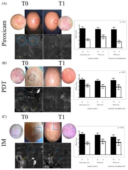 Clinical, dermoscopic, and reflectance confocal microscopy evaluation before (T0) and after treatment (T1). In the panels on the left, the images represent the clinical aspects of the target lesion and the field of cancerization of the scalps of different patients treated with different therapies: (A) medical device 0.8% piroxicam and 50+ sunscreen, (B) photodynamic therapy (PDT), (C) 0.015% ingenol mebutate (IM) gel; the dermoscopic features of the target lesion, in detail; and reflectance confocal microscopy mosaic (6 × 6) aspects of the target lesion and the field of cancerization. The blue circles and arrows indicate the atypical honeycombing pattern, constituted by pleomorphic keratinocytes; the red asterisks areas of detached keratinocytes; the green arrows inflammatory infiltrate; and the yellow arrows hyper- and para-keratosis. In the panels on the right, we report the dermoscopic and reflectance confocal microscopy scores of the target lesion and the reflectance confocal microscopy scores of the field of cancerization for the respective treatments.