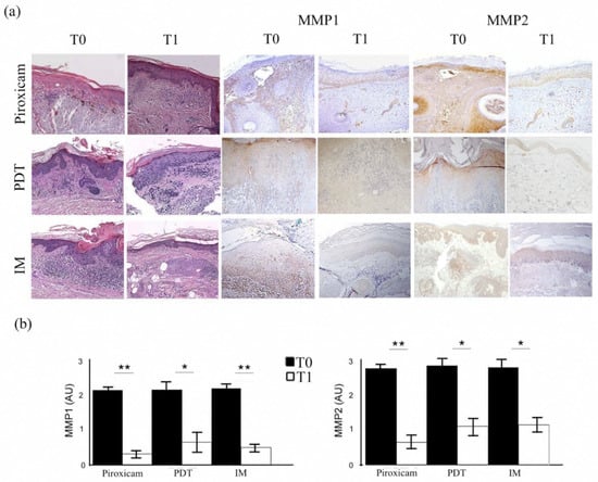 Histopathological features and metalloproteinase-1 and -2 expression in target lesions before (T0) and after treatment (T1). (a) The first two columns show the histopathological aspects of actinic keratoses before and after treatment with medical device 0.8% piroxicam and 50+ sunscreen, photodynamic therapy (PDT), and ingenol mebutate (IM) gel (hematoxylin–eosin, original magnification: 100×). The two central columns show images demonstrating the immunohistochemical expression of matrix metalloproteinase-1 (MMP1), while the last two show the staining for matrix metalloproteinase-2 (MMP2) in the target lesions before and after each treatment (original magnification: 100×). (b) Semiquantitative evaluation of matrix metalloproteinase expression before and after each therapeutic agent. * p < 0.01; ** p < 0.001.