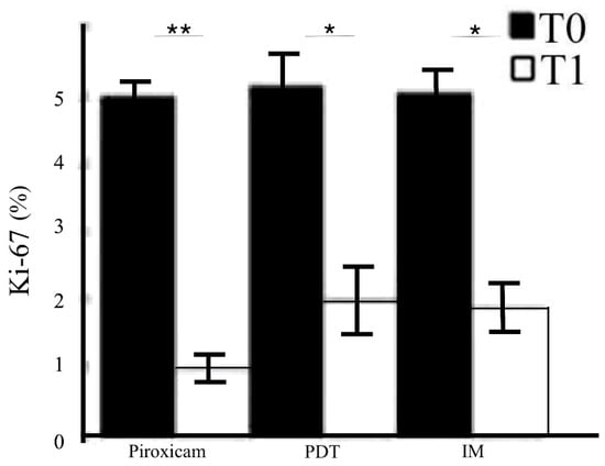 Immunohistochemical evaluation of the proliferation rate of the target lesions by Ki-67 before and after treatment. Semiquantitative evaluation of Ki-67 before and after medical device 0.8% piroxicam and 50+ sunscreen, photodynamic therapy (PDT), and ingenol mebutate (IM) gel. * p < 0.01; ** p < 0.001.