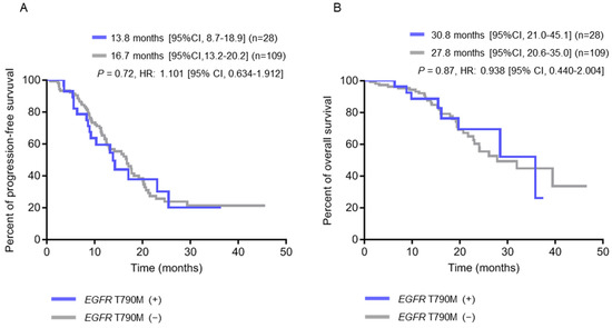 Kaplan-Meier survival analysis according to pre-treatment EGFR T790M status in baseline tumor tissue (N = 137). (A) Progression-free survival (PFS) curves. (B) Overall survival (OS) curves.