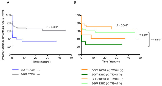 Brain metastasis-free survival (BMFS) analysis (N = 137). (A) BMFS curves of patients with pre-treatment EGFR T790M (+) (N = 28) and (−) (N = 109). (B) BMFS curves of patients with pre-treatment EGFR L858R (+)/T790M (+) (N = 16), L858R (+)/T790M (−) (N = 61), E19D (+)/T790M (+) (N = 12) and E19D (+)/T790M (−) (N = 48) in baseline tumor tissue. * p < 0.05, indicating significance. Abbreviation: E19D, exon 19 deletions.