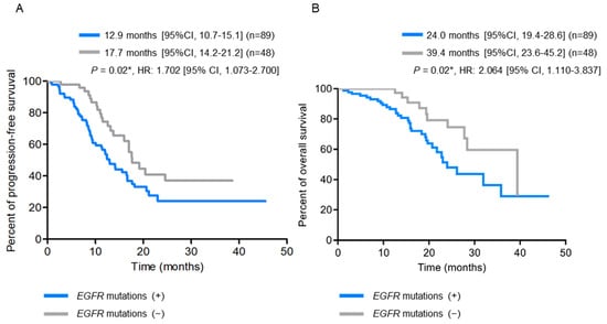 Kaplan-Meier survival analysis according to baseline plasma EGFR-activating mutation status (N = 137). (A) Progression-free survival (PFS) curves. (B) Overall survival (OS) curves. * p < 0.05, indicating significance.