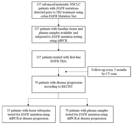 This was a single-center prospective observational study. Patients who were pathologically diagnosed with lung adenocarcinoma, were positive for EGFR-activating mutations determined by the routine cobas EGFR Mutation Test (v1 was used before 31 March 2017, and v2 was applied thereafter; Roche Molecular Systems, Inc.), had inoperable stage IIIB or IV diseases according to the 7th edition of the American Joint Committee for Cancer staging system [26] and planned to receive EGFR-TKIs as their first-line therapy with either gefitinib, erlotinib or afatinib were enrolled. Gefitinib, erlotinib and afatinib are the only first-line EGFR-TKIs that have been reimbursed by the Taiwan National Health Insurance scheme for advanced EGFR mutation-positive lung adenocarcinoma; therefore, patients with osimertinib as a first-line treatment were not available in this study. Patients were excluded if they had another active malignancy or any prior treatment that could influence the tumor burden. All enrolled patients were subjected to blood collection according to standard procedures at baseline (within 7 days before the first dose of EGFR-TKI) and at the time of disease progression. Treatment response was evaluated every 3 months with computed tomography (CT) by specialized radiologists, according to the Response Evaluation Criteria in Solid Tumors version 1.1 [40]. From June 2015 to July 2018, a total of 137 lung adenocarcinoma patients at Taipei Veterans General Hospital (Taipei city, Taiwan) were enrolled in this study (Figure 4). The prior-to-treatment (at baseline) and rebiopsy (at disease progression) tumor tissues and plasma samples were analyzed for EGFR mutation status using ddPCR. Clinical characteristics, including the patients’ age, gender, smoking history, distant organ metastasis, first-line EGFR-TKIs, EGFR mutation status, date of initial diagnosis, treatment start date, time to disease progression, date of death or last follow-up, etc., were collected. Never-smokers were defined as patients who had never smoked cigarettes, whereas smokers were defined as those who were current or former smokers. The study protocol was approved by the institutional review board (IRB) of Taipei Veterans General Hospital.
