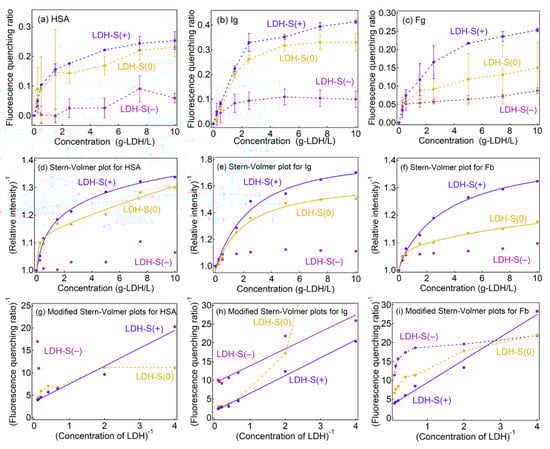 | Proteins | LDHs | Fitting Equation | KSV(1) (L(g-LDH)−1) | KSV(2) (L(g-LDH)−1) | f(1) | f(2) | f(3) |