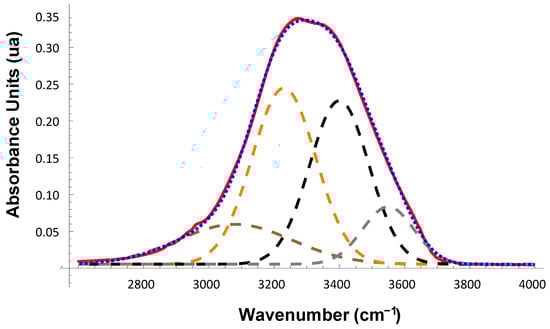 Examples of the ATR-FTIR spectra of OH-stretch band in the solvent for 250 mg/mL β-lactoglobulin A in 0.15 M NaCl in 0.01 M Na-phosphate buffer, pH 7.4 (PBS). The blue dotted line is the measured absorption spectrum, and the red envelope is the best fit of the sum of our four Gaussian components (dashed lines at positions (3080 cm−1 (dark orange), 3230 cm−1 (orange), 3400 cm−1 (black), and 3550 cm−1 (gray)). Experimental data and fit are visually almost indistinguishable.