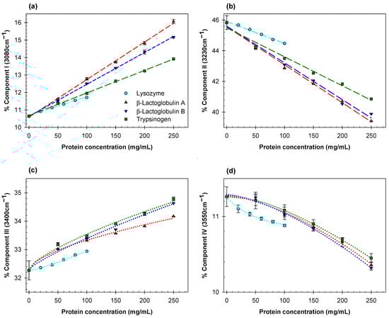 Estimates of the relative contributions of the Gaussian components I (3080 cm−1), component II (3230 cm−1), component III (3400 cm−1), and component IV (3550 cm−1) for all the proteins examined here at various concentrations are listed in Supplementary Information (Table S1). Concentration dependences of the relative contributions of the Gaussian components I-IV for human and bovine albumins, ovalbumin, and human γ-globulin are plotted in Figure 2a–d. Analogous dependences for lysozyme, β-lactoglobulins A and B, and trypsinogen are shown in Figure 3a–d. We display the eight proteins, measured separately, in two groups for clarity.