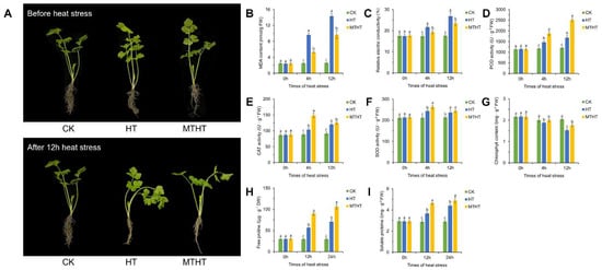 Effects of heat stress on celery. (A) Phenotypic characteristics of celery seedlings under heat stress. (B–I) Effects of heat stress on physiological characteristics of celery. (B) Malondialdehyde (MDA), (C) relative conductivity, (D) peroxidase (POD), (E) catalase (CAT), (F) superoxide dismutase (SOD), (G) chlorophyll content, (H) free proline content, and (I) soluble protein. Each error line represents the mean ± SD, t-test with significance level of 0.05 (p < 0.05). The different letters (a–c) indicate a significant difference, and the same letter indicates no significant difference. CK: non-treatment group, HT: water-sprayed group, MTHT: 100 μmol·L−1 MT-sprayed group.