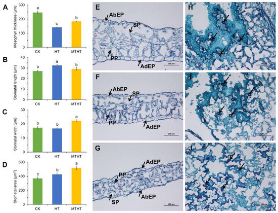 The morphology and stomatal movement of celery leaves under heat stress were observed. After 4 h of heat stress, the mesophyll thickness of the leaves treated with MTHT and HT was significantly reduced compared with those of CK (Figure 2A,E–G). The spongy and palisade tissue in CK and MTHT leaves were arranged in regular shapes, and the upper and lower epidermal cells were full-shaped. In HT leaves, spongy, palisade, and upper and lower epidermal cells became thin with severe cell dehydration (Figure 2E–G). The stomata also varied significantly among the three treatment groups (Figure 2B–D, H–J). In response to heat stress, leaves treated with MTHT increased their transpiration rate with the stomatal aperture opened. As a result, the width, length, and area of the stomata were higher than those of CK. In contrast, HT leaves were dehydrated and wilted, having lost water in guard cells, resulting in the stomata closing. The width and area of HT stomata were lower than those of CK.
