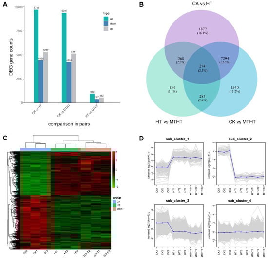 Among the screened DEGs, there were 9713 DEGs in the CK vs. HT comparison pair, 5277 of which were shown to be upregulated, and 4436 of which were downregulated. Among CK vs. MTHT, 9391 DEGs were commonly expressed, 5141 of which were upregulated, and 4250 of which were downregulated. About 959 DEGs in HT vs. MTHT were identified, with 562 upregulated DEGs and 397 downregulated DEGs (Figure 3A). Two or more comparisons analyzed three comparison pairs for common and uniquely expressed genes. Figure 3B shows the largest number of commonly detected DEGs between the CK vs. HT and CK vs. MTHT comparison pairs, a total of 7568, which is 64.8% of the total. The number of DEGs in CK vs. MTHT was 337 fewer than in CK vs. HT due to the administration of exogenous MT. There were only 134 DEGs present in HT vs. MTHT, indicating the key genes in response to heat stress under MT induction.