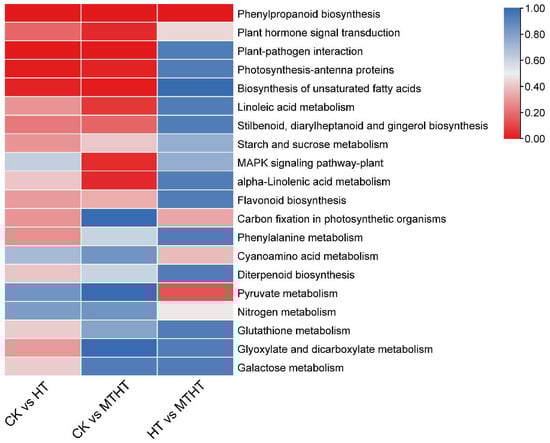 The DEGs were further mapped to the KEGG database in order to investigate the metabolic pathways. Twenty metabolic pathways with significant expression were selected to make a heat map, as shown in Figure 6. KEGG annotations were largely found in the “Phenylpropanoid biosynthesis” and “Plant hormone signal transduction” pathways among the three comparison pairs. Nevertheless, “Plant-pathogen interaction”, “Photosynthesis-antenna proteins”, “Biosynthesis of unsaturated fatty acids”, “Linoleic acid metabolism”, “Stilbenoid”, “diarylheptanoid and gingerol biosynthesis”, and “Starch and sucrose metabolism” were abundant in CK vs. HT and CK vs. MTHT. Notably, the “Pyruvate metabolism”, “Cyanuric acid metabolism”, and “Nitrogen metabolism” pathways were only found in significant amounts in the HT vs. MTHT comparison pair. Thus, applying MT decreases the damage of heat stress on celery seedlings by altering the pyruvate metabolism, the cyanuric acid metabolism, and the nitrogen metabolism.