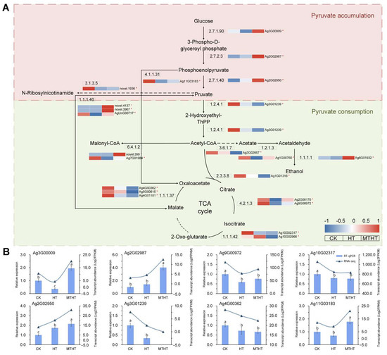 Two heat-stress responsive metabolic pathways of celery treated with MT were identified through function annotation (Table S2). In the pyruvate metabolic pathway, as displayed in Figure 7A, enzyme-coding genes in the synthesis pathway from glucose to pyruvate were upregulated in MTHT by exogenous MT, including pyruvate kinase (2.7.1.40), phosphofructokinase-1 (2.7.1.90), and phosphoglycerate kinase (2.7.2.3). Most of the enzyme-coding gene expression in the pyruvate metabolic pathway participating in the TCA cycle showed a reducing trend. The expression of two key enzyme-coding genes in pyruvate consumption, pyruvate dehydrogenase (4.1.1.31) and isocitrate dehydrogenase (NADP+) (1.1.1.42), was significantly downregulated in the TCA cycle, as well as other genes associated with pyruvate consumption. The induction of exogenous MT altered the pyruvate metabolizing enzymes and caused the accumulation of pyruvate in cells, which is involved in ROS-scavenging. Eight genes in the pathway were selected for RT-qPCR validation, as shown in Figure 7B. The three key enzymes in the pyruvate synthesis pathway were phosphoglycerate kinase and pyruvate phosphofructokinase-1 genes (Ag3G00009, Ag2G02897, Ag2G02950). Their expression levels in MTHT were significantly increased by 4.65, 2.72, and 1.53 times compared with HT. Pyruvate dehydrogenase (Ag3G01239), which plays a role in the mitochondrial synthesis of acetyl-CoA, decreased significantly in MTHT after MT application. In the TCA cycle, the expression of aconitate hydratase (Ag9G00972), isocitrate dehydrogenase (NADP+) (Ag10G02317), and malate dehydrogenase (Ag4G00362) decreased in both HT and MTHT. These results are in agreement with the gene expression patterns in transcriptome sequencing.