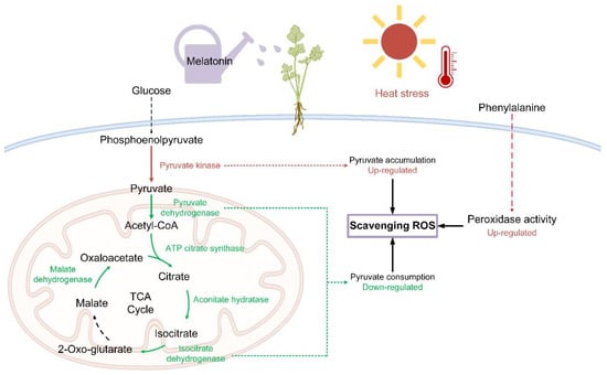Hence, exogenous MT enhanced the antioxidant enzyme activity in celery seedling cells, promoted the accumulation of pyruvate, enhanced the synthesis of antioxidants, rapidly removed ROS, and relieved the oxidative stress of cells, protecting the celery seedlings from heat stress, as shown in Figure 9.