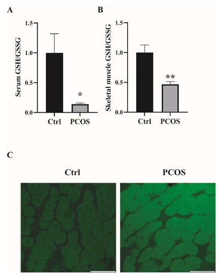 Increased oxidative stress in the whole-body and skeletal muscles of mice with DHEA-induced PCOS. (A) Metabolomics analysis of GSH/GSSG in serums of PCOS and control mice. (B) Metabolomics analysis of GSH/GSSG in the skeletal muscles of PCOS and control mice. (C) Representative photomicrographs of ROS relative fluorescence units (RFU) in the soleus muscles were measured by staining with DCFH-DA. Scale bar = 100 μm. Asterisks indicate significant differences between control and PCOS mice. The data are presented as means ± SEM. *, p < 0.05, **, p < 0.01, n = 6,7 per group.
