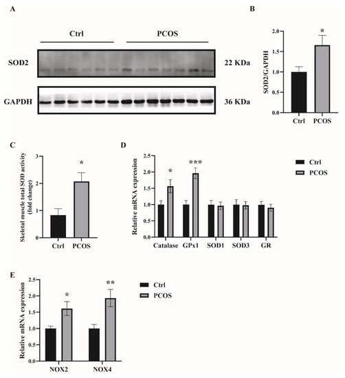 The expression of antioxidant-related genes in the skeletal muscles of the mice. (A,B) Western blot analysis and densitometry quantification of SOD2 in skeletal muscles of PCOS and control mice. (C) Total SOD activity in the skeletal muscles of PCOS and control mice. (D) Relative mRNA levels of the genes Catalase, GPx1, SOD1, SOD3, and GR in the skeletal muscles of PCOS and control mice. (E) Relative mRNA levels of the genes NOX2 and NOX4 in the skeletal muscles of PCOS and control mice. Asterisks indicate significant differences between control and PCOS mice. The data are presented as means ± SEM. *, p < 0.05, **, p < 0.01, ***, p < 0.001, n = 6,7 per group.