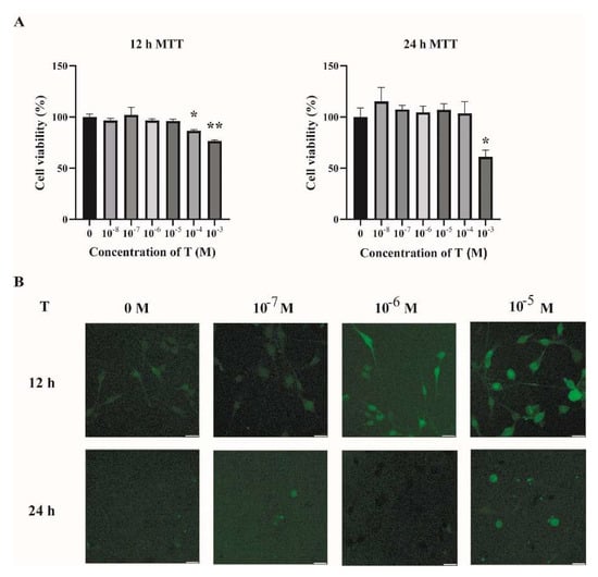 Increased ROS levels in T-treated C2C12 cells. (A) Fully differentiated C2C12 cells were treated with T (0, 10−8, 10−7, 10−6, 10−5, 10−4, and 10−3 M) for 12 h and 24 h. Cell viability was then measured by MTT assay. The data are means ± SEM of three independent experiments. Asterisks indicate significant differences between the vehicle-treated group and the different T treatment concentrations. *, p < 0.05, **, p < 0.01. (B) Representative photomicrographs of intracellular ROS detection in C2C12 cells after exposure to T at different concentrations for 12 h and 24 h. Intracellular ROS levels were quantified by DCFH-DA staining. Scale bar = 25 μm. T= testosterone.