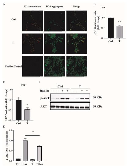 One main source of cellular ROS is mitochondria. We thus determined the mitochondrial function of T-treated C2C12 cells. Previously, we found that treatment of C2C12 cells with T at 5 × 10−7 M for 24 h impaired mitochondrial function and induced insulin resistance [14]. In this study, we used T at 10−5 M to treat C2C12 cells for 12 h, and treatment with T at 0 M was used as a control (Ctrl). Mitochondrial membrane potential was measured. Our results showed that the ratio of JC-1 monomers to JC-1 aggregates was significantly lower in T-treated cells (Figure 4A,B), suggesting the decreased mitochondrial membrane potential in these cells. The major role of the mitochondria is to generate ATP for the cells. We then measured the ATP levels. The ATP production was markedly reduced in T-treated C2C12 cells, as shown in Figure 4C. Thereafter, we detected insulin signaling in C2C12 cells treated with 10−5 M of T for 12 h. Consistent with our previous report, cells treated with insulin+T exhibited blunted phosphorylation of Akt compared with insulin treatment alone (Figure 4D,E), suggesting the decreased insulin sensitivity in T-treated cells.