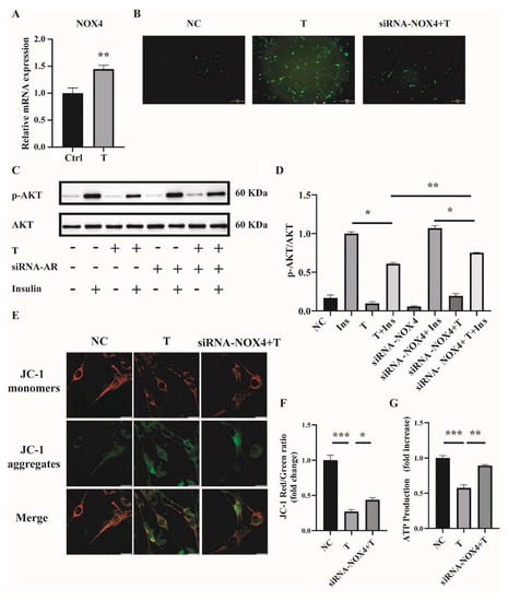 Handayaningsih et al. reported that NOX4 is dominantly expressed in C2C12 cells and it plays an important role in producing ROS in C2C12 cells [15]. We thus measured NOX4 expression in C2C12 cells treated with 10−5 M of T for 12 h. Cells treated with 0 M of T were used as control (Ctrl). As illustrated in Figure 5A, the relative mRNA level of NOX4 was significantly increased in T-treated C2C12 cells compared with control. To figure out whether NOX4 plays a role in producing ROS in T-treated C2C12 cells, the expression of NOX4 was knocked down by transfection of siRNA-NOX4 in C2C12, followed by the treatment with 10−5 M of T for 12 h. The knockdown efficiency of NOX4 in C2C12 cells was revealed by quantitative PCR (qPCR). The mRNA level of NOX4 was reduced by about 42% with siRNA-NOX4 (Supplemental Figure S1A). We then examined the effect of NOX4 knockdown on ROS production in T-treated C2C12 cells. ROS production was significantly decreased when NOX4 expression was knocked down in T-treated cells (Figure 5B). In addition, insulin sensitivity was improved by the knockdown of NOX4 in T-treated C2C12 cells, as revealed by the marked difference in the ratio of p-AKT/AKT between the siRNA-NOX4+T+Insulin and the T+Insulin groups (Figure 5C,D). Mitochondrial membrane potential and ATP production were measured as well. As shown in Figure 5E,F, knockdown of NOX4 increased T-treated cell mitochondrial membrane potential. Similarly, ATP production was significantly increased in the siRNA-NOX4+T group compared with the T group (Figure 5G). These results suggested that T induced ROS production in C2C12 cells by increasing NOX4 expression.